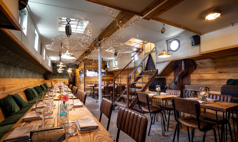 Set inside a restored 125-year-old Dutch barge, it brings together award-winning food, sustainable produce, and unforgettable views across two unique spaces.
